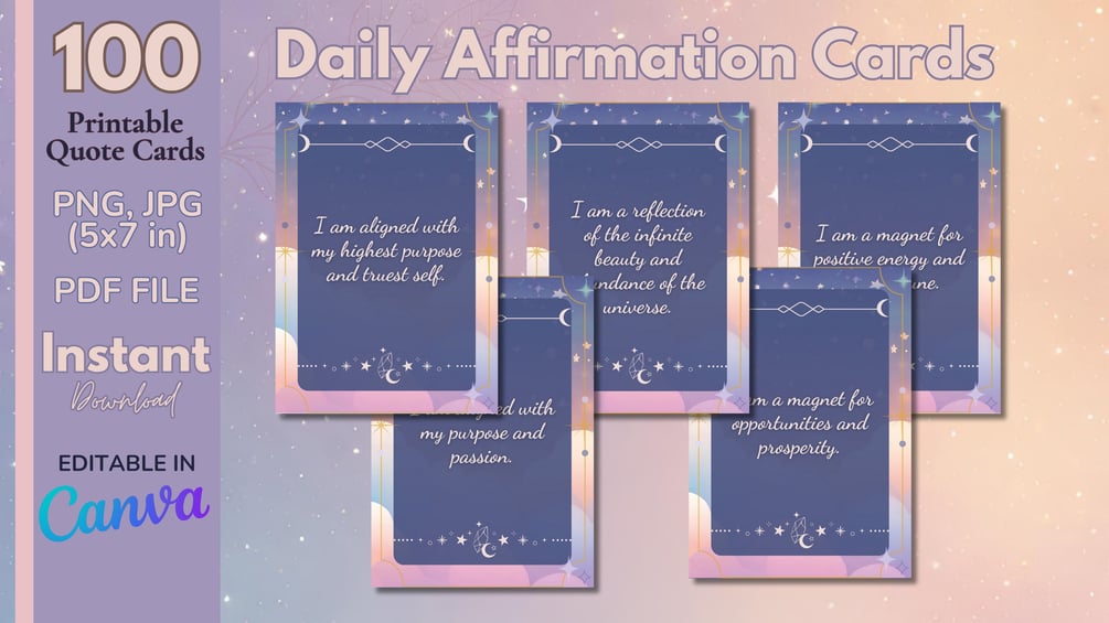 Available in PDF, PNG, and JPG formats, these printable cards are perfect for daily inspiration, meditation, or gifting to loved ones. Elevate your mindset and embrace the magic of the universe with Celestial Affirmations: Printable Card Collection.